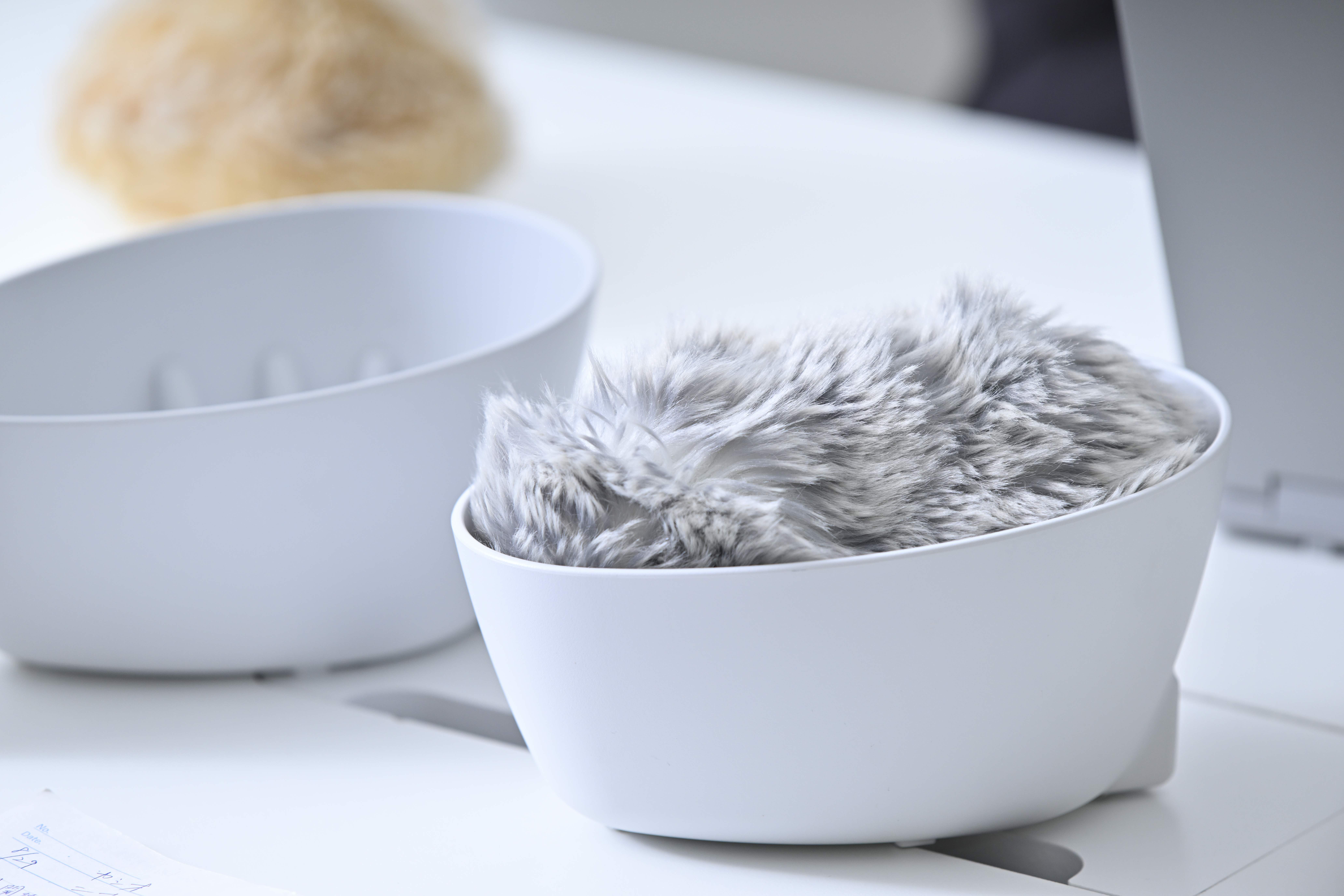 機能を削ぎ落としてコンパクトにする――その哲学とは反対に、モフリンに足されたのが、毛(フェイクファー)です。モフリンのもふもふとしたフェイクファーは、愛おしさを増幅させる大きな要素といえるでしょう。「プラスチックのままだと、どうしても生き物に見えないから」というのもうなずけます。