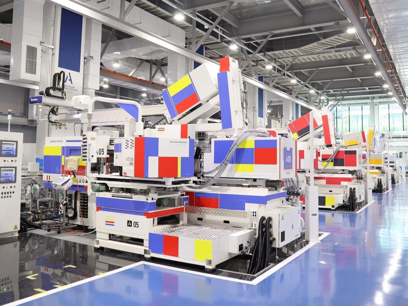 「働くときの“相棒”となる成形機も、働く人が自分の好きな色のパターンをラッピングできるようにしています。また、生産効率に加えて見学者からの“映え”も意識し、部品を自動で搬送する天井搬送台車のレールを空中に設置しました。まるで空中を走っているかのように見えるんですよ」
