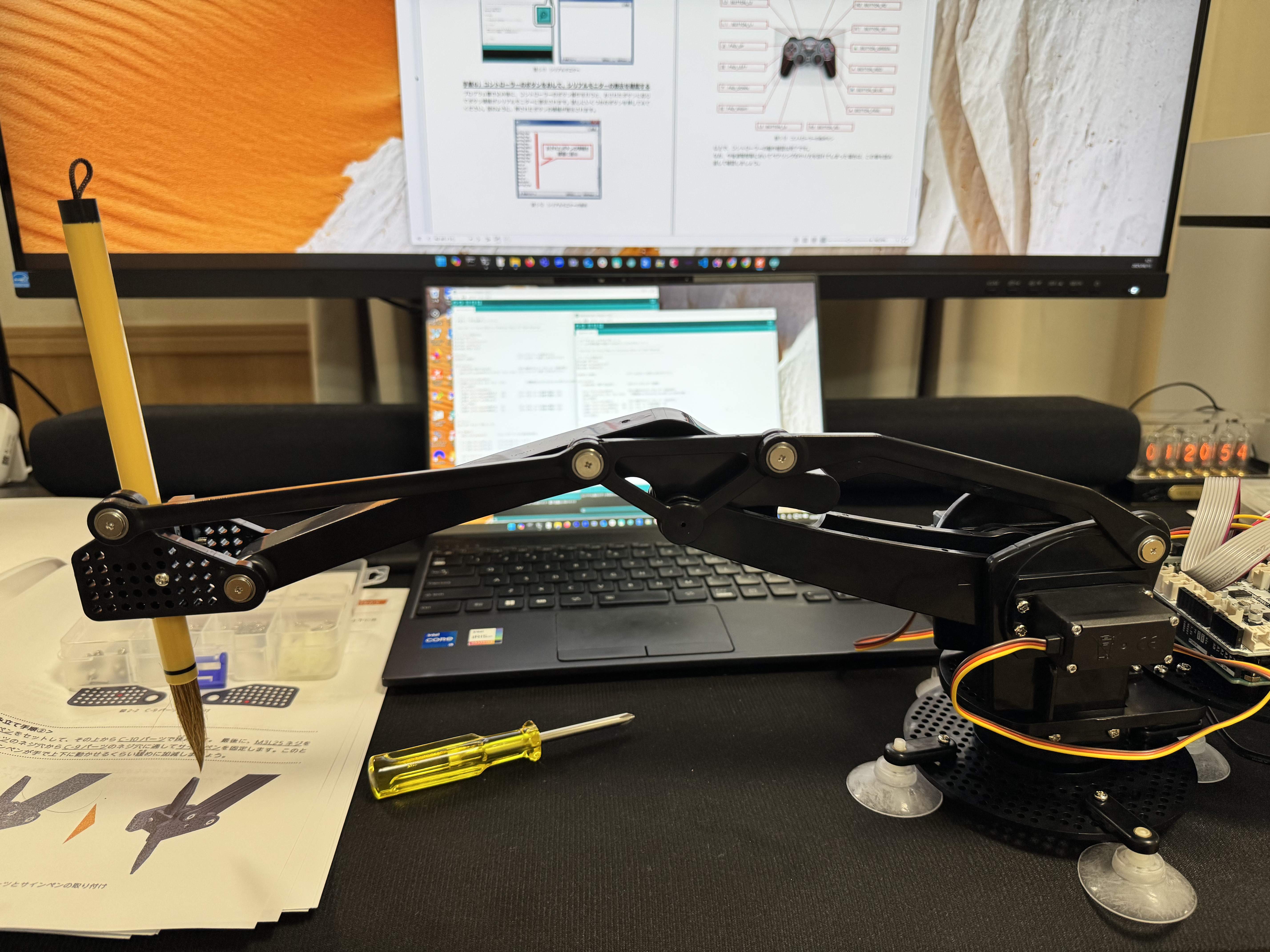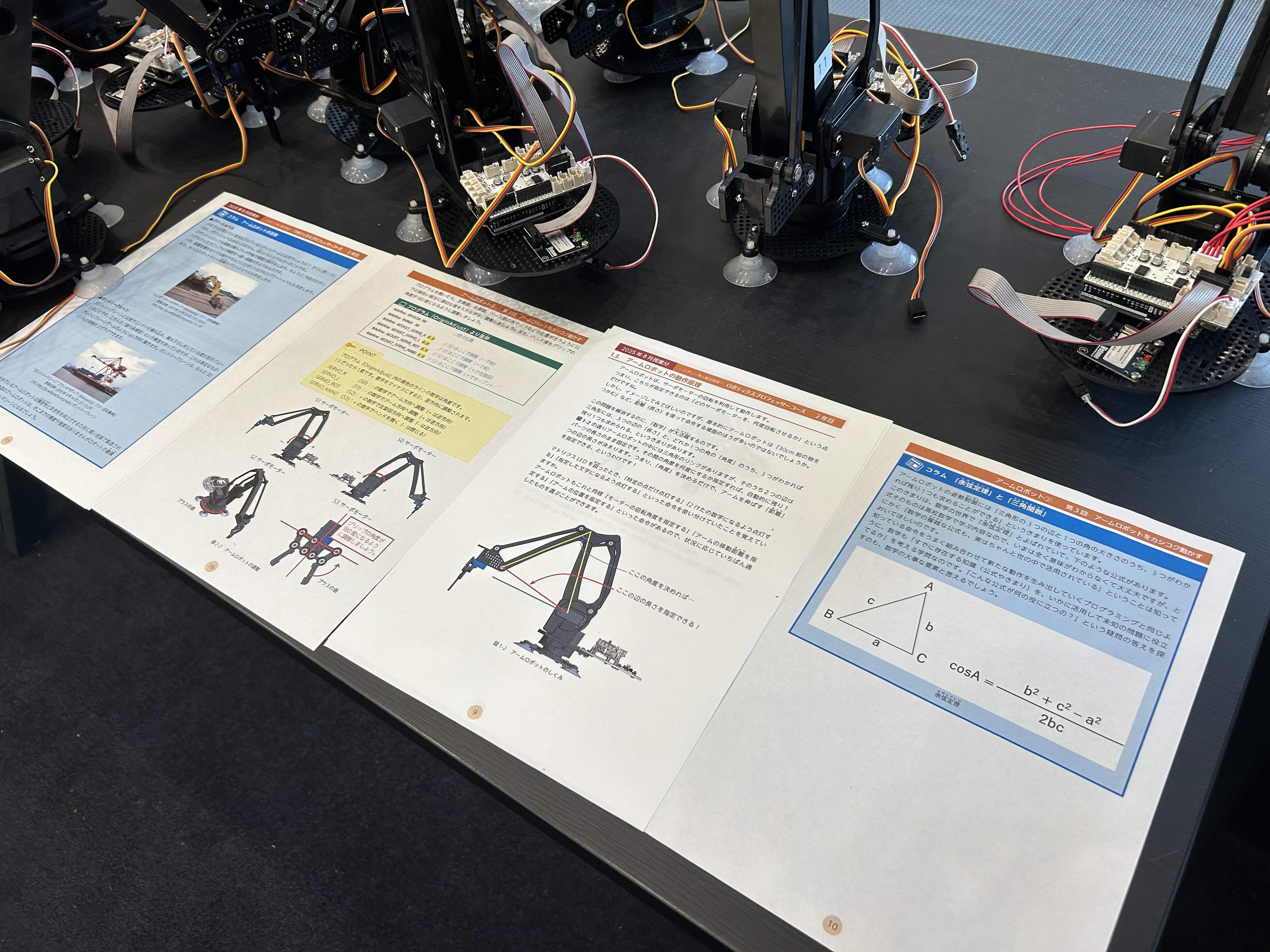 特に、アームロボットの教材は象徴的でした。ロボットの関節を動かして筆を目的の位置に導くには、角度や位置の計算が欠かせません。ここで使うのが三角関数、特に余弦定理です。普段は、公式を暗記するだけと思われがちな内容が、自分が作ったロボットを思い通りに動かすために必要な知識として立ち現れるのです。