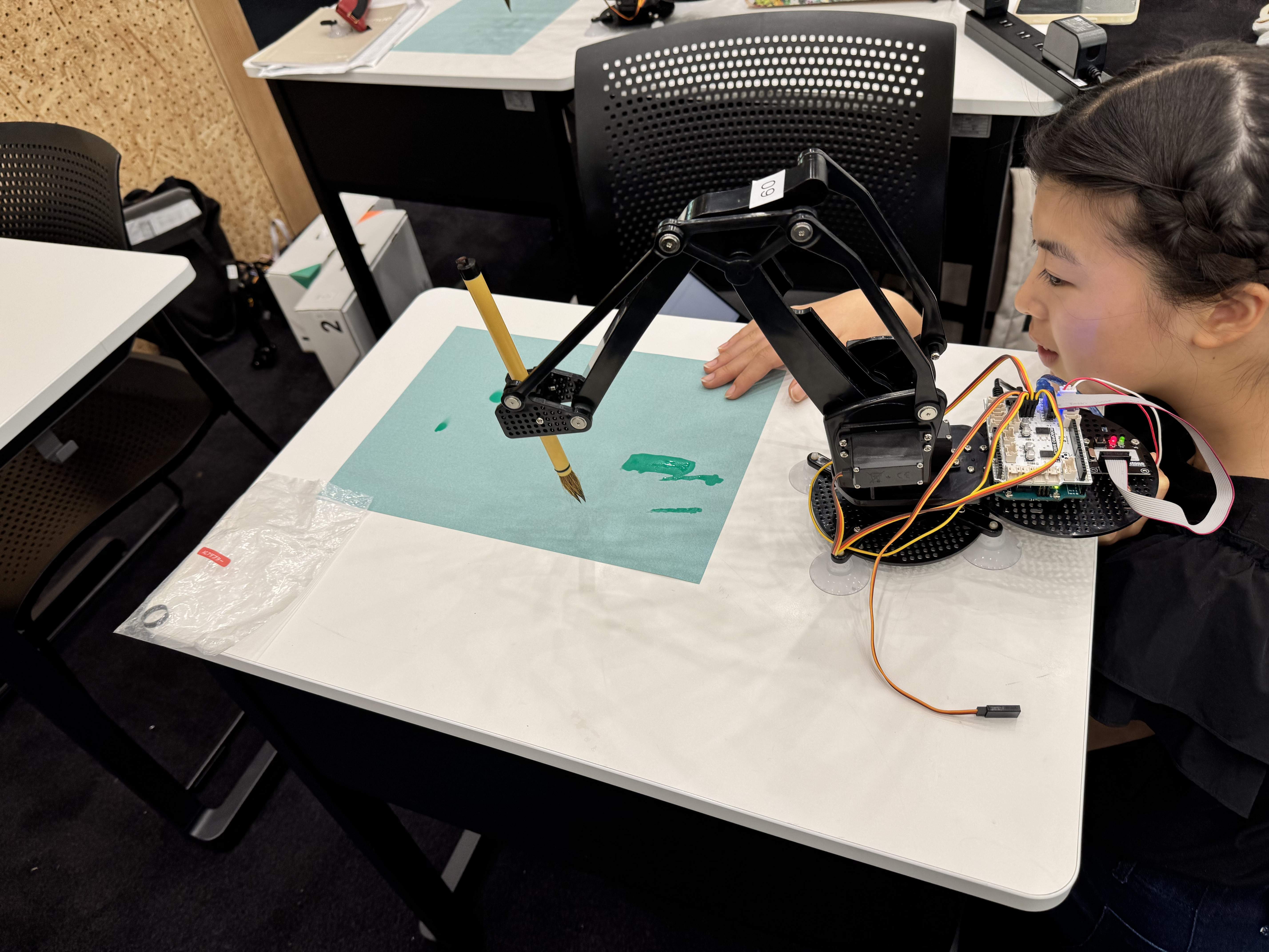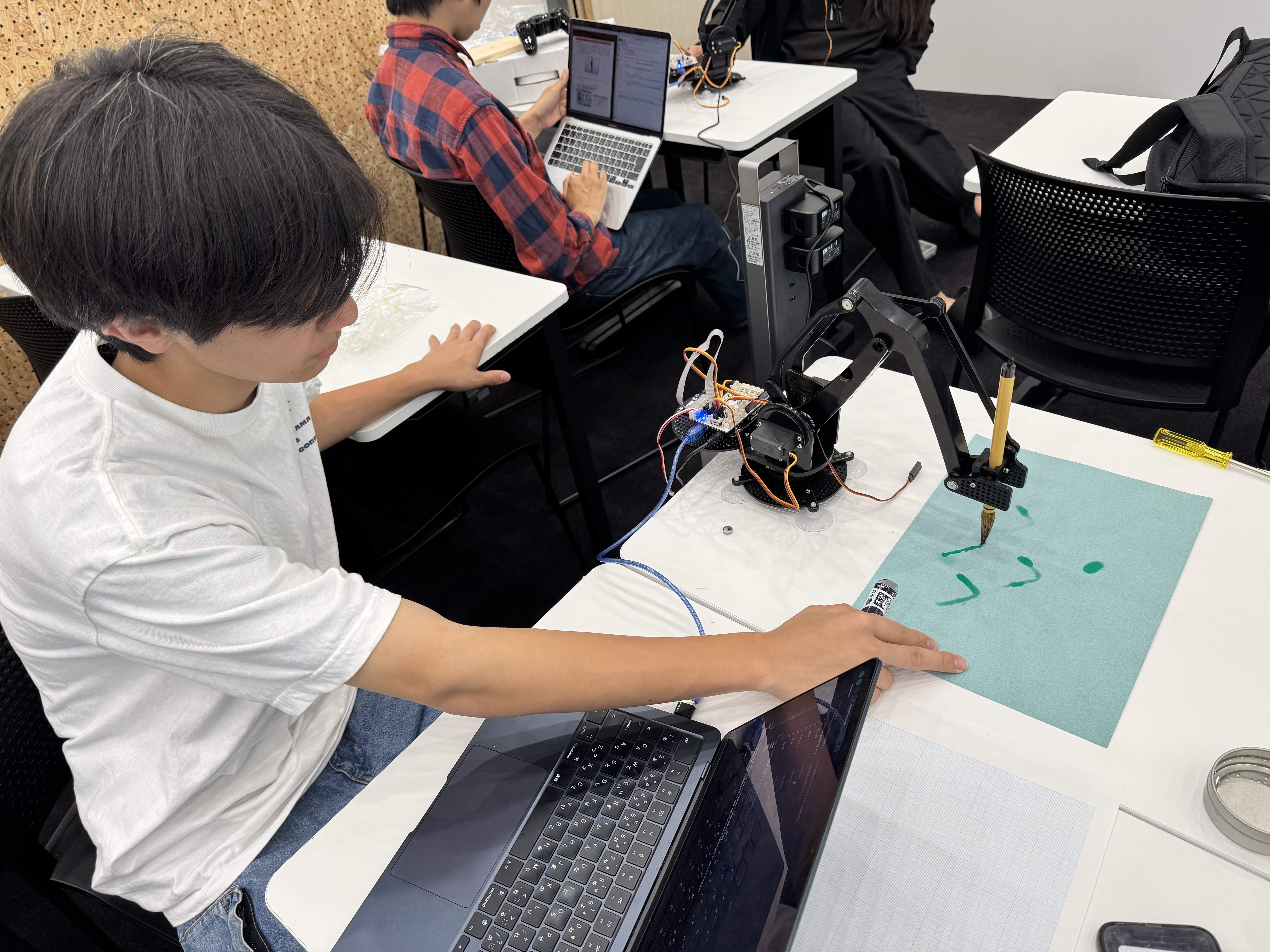 例えば、ある学生は「どうすればロボットに自分の名前を書かせられるか」という課題に挑戦しました。目的を達成するには、角度や距離の計算が不可欠です。最初は苦戦しましたが、試行錯誤の末にロボットが正しく文字を描いた瞬間、学生の顔には達成感が広がりました。